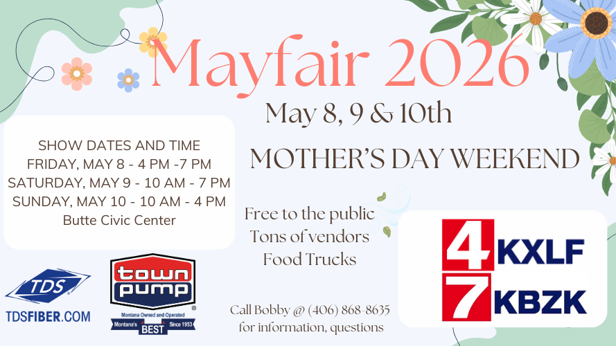 Butte’s Made-fair and trade show, organized by KXLF, takes place on Mother’s Day Weekend—that’s May 8th, 9th, and 10th. Booth setup will start the morning of May 8th and MAYFAIR will open to the public at 4:00 pm the same day.